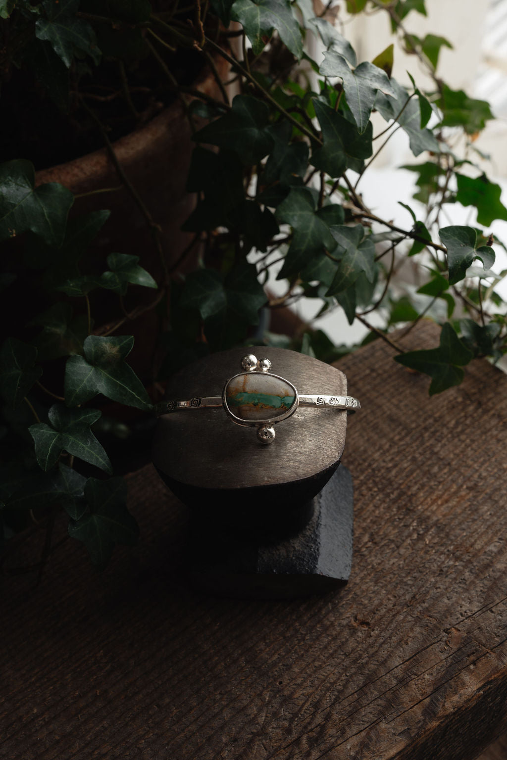Sterling silver cuff with an oval Boulder Ribbon cabochon. A lovely neutral that can be worn with anything. Whimsical hand stamped band with swirls and daisies gives off a fun nature vibe. Solid sterling balls are asymmetrical accents on the stone frame and on the ends of the wire under the wrist. Can be worn alone, with a watch, or stacked.